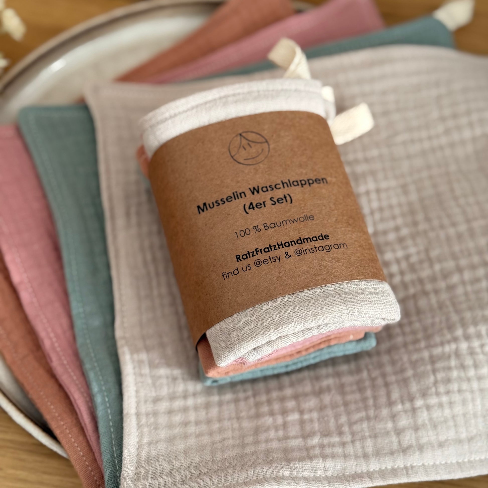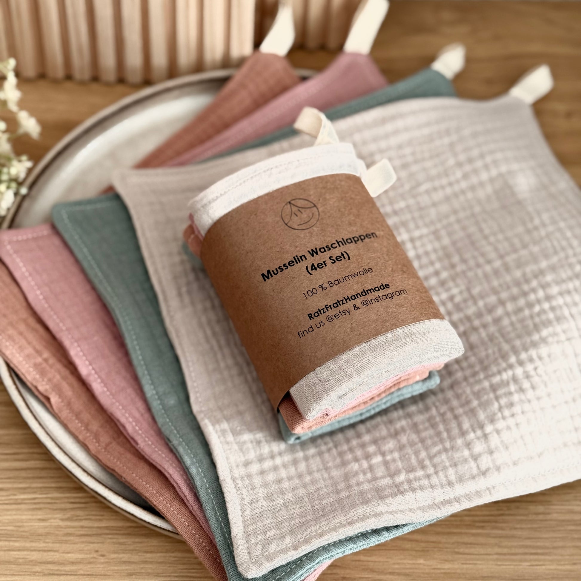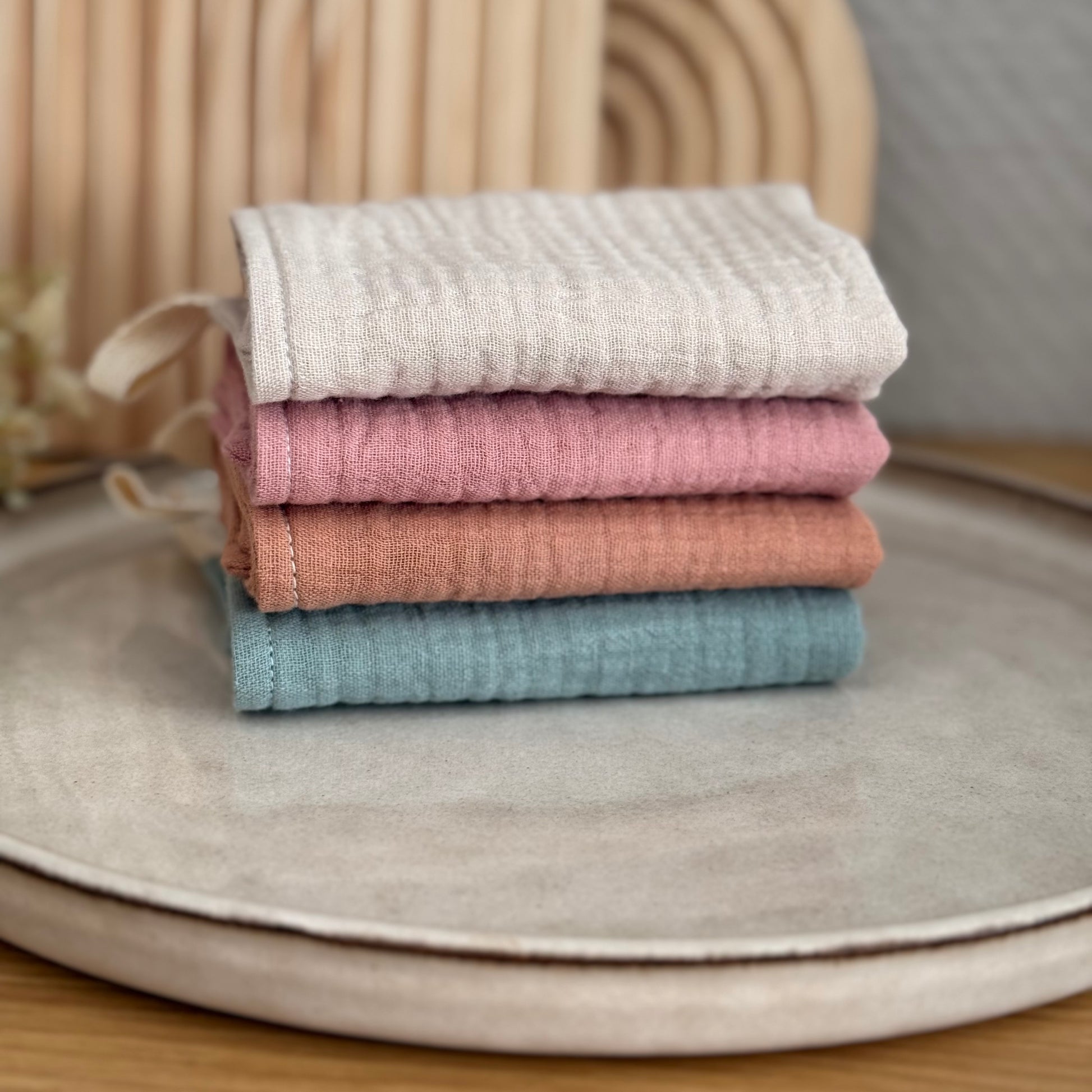 Unsere Waschlappen aus hochwertigem Musselin sind der perfekte Begleiter für zarte Haut – ob beim Baden, Wickeln oder bei der täglichen Gesichtspflege. Das Set besteht aus vier Waschlappen in harmonisch abgestimmten Naturtönen.